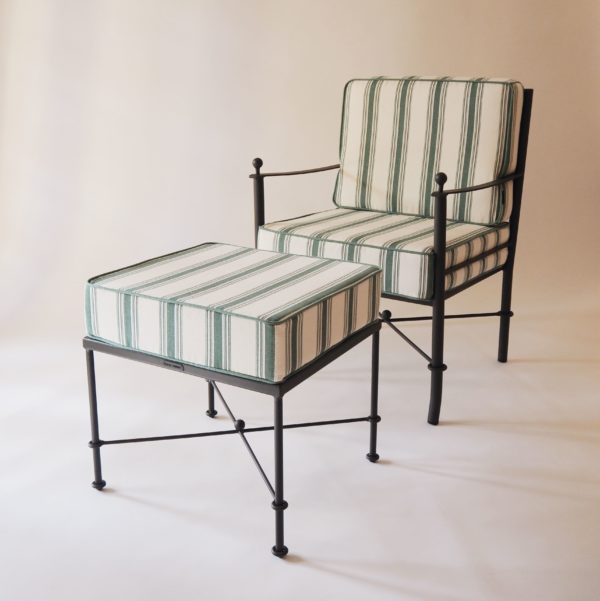 Wrought iron outdoor bench with seat cushion. The Sotogrande collection, crafted with masterful artistry, aims to bring quality and warmth to any outdoor living space. Designed to last and enhance any setting, Sotogrande is distinguished by its meticulous attention to detail, combining comfort and aesthetics. Includes 20 cm thick seat cushions with double piping and zippers for easy removal of covers. Custom fabric options are available; please contact us at fustaiferro@fustaiferro.com. Made in Spain.
